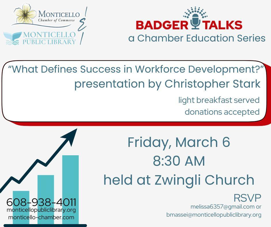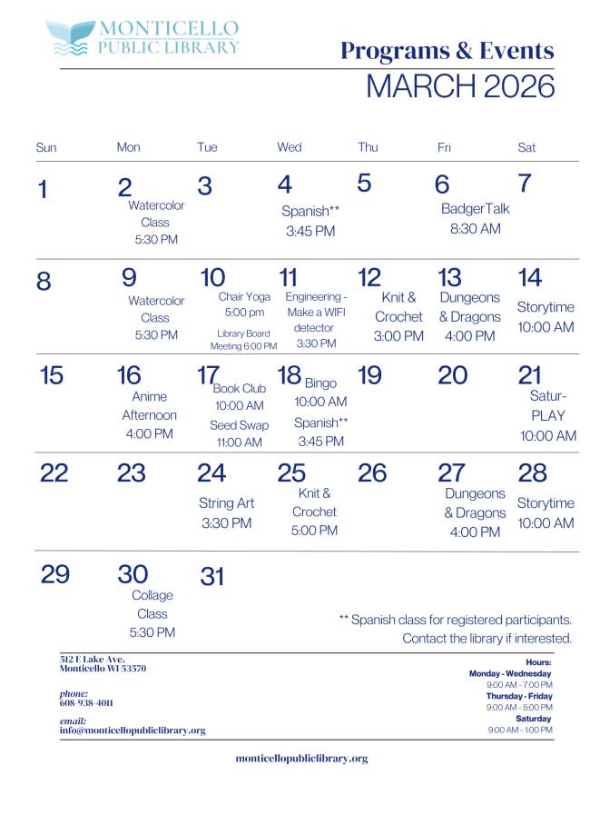 Cal Categories Community Event Meeting Park & Rec Shelter Rental Tags 5K Breast Cancer Awareness Clothing Drive Garage Sales Heart Failure Kalberwurst Dinner Monroe Clinic Monticello Monticello Lion's Munch & Learn New Glarus New Medication Pancake Brunch Prevention SSM Health Sugar River Bike Trail Trunk Treat Village Wide Sales WI Zwingli United Church of Christ Agenda Agenda Month March 2026 Mar 2026 Collapse All Expand All Mar 2 Mon Shoe Drive – Donate Your Shoes! Tickets Mar 2 – Apr 9 all-day Mar 6 Fri Badger Talk – Success in Workford Development @ Zwingli UCC Tickets Mar 6 @ 8:30 AM Chamber Board Meeting @ Mt.Pleasant Perry Mutual Tickets Mar 6 @ 12:00 PM Click to Download/Print Meeting Calendar Mar 9 Mon Watercolor Class @ Monticello Library Tickets Mar 9 @ 5:30 PM – 7:00 PM Mar 10 Tue Chair Yoga @ Monticello Library Tickets Mar 10 @ 5:00 PM Mar 11 Wed Next Gen – WIFI Detector @ Monticello Library Tickets Mar 11 @ 3:30 PM NextGen Engineering @ Monticello Library Tickets Mar 11 @ 3:30 PM NextGen Engineering Second Wednesday of every month Arrive anytime between 3:30 & 4:00 PM to get started. New activities every week! Mar 12 Thu Knit & Crochet Group @ Monticello Library Tickets Mar 12 @ 3:00 PM Mar 13 Fri Dungeons & Dragons @ Monticello Library Tickets Mar 13 @ 4:00 PM Mar 14 Sat Rise & Ryme Storytime @ Monticello Library Tickets Mar 14 @ 10:00 AM March 2026 Mar 2026 Subscribe Add to Timely Calendar Add to Google Add to Outlook Add to Apple Calendar Add to other calendar Export to XML