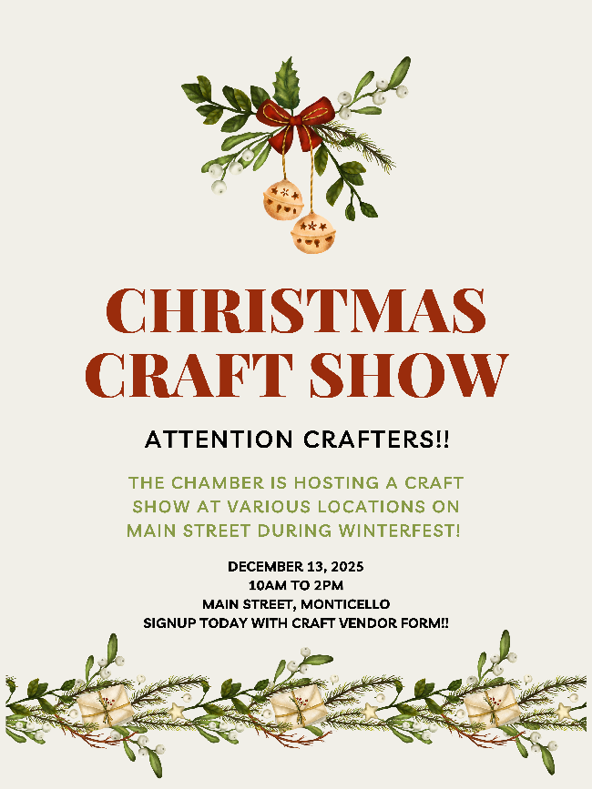 The Monticello Chamber is hosting a craft show at various locations durning the annual Winterfet event. Saturday, December 13, 2025 from 10am – 2pm. Locations on Main Street – Monticello TBD once all participants are finalized. SIGN-UP TODAY- DOWNLOAD THE VENDOR FORM. Deadline to participate is November 10th.